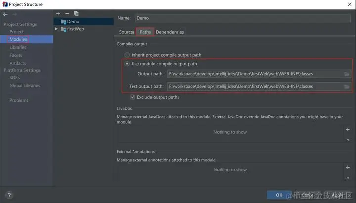 选择Module 下的Paths选项卡 -> 勾选”Use module compile output path”,随后将Output path和Test output path路径均指向上述创建的classes文件夹