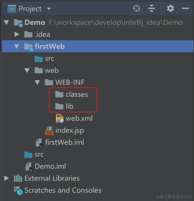 随后在对应的Module下的web目录下分别创建两个文件夹lib、classes用于存放数据(classes用于存放编译后的输出文件;lib用于存放第三方jar包)
