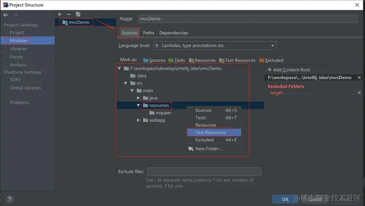 配置资源文件夹(Source Folder):File->Project Structure,选中指定工程,选择Sources选项卡,随后右键点击要配置的文件夹resources,选中Test Resources即可;右键点击java文件夹选中Sources