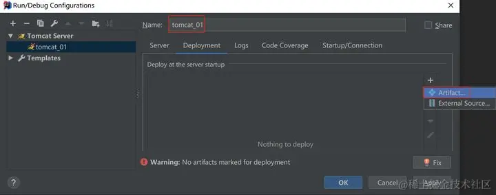 在Tomcat中部署并运行项目,选中Deloyment选项卡,点击‘+’号选择Artifact