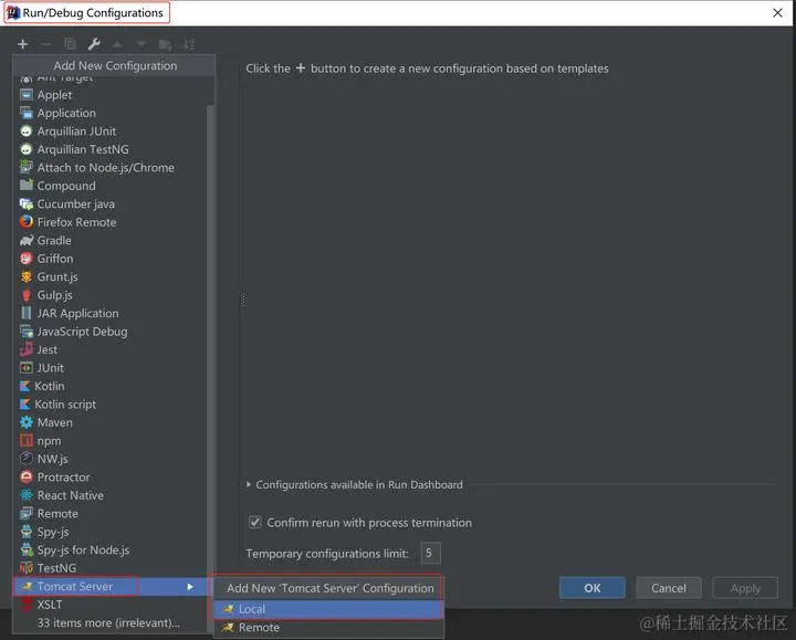 Run -> 选择Edit Configuration->点击‘+’号,选中Tomcat Server->Local