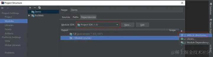 随后选择Dependencies -> 将Module SDK选择为1.8 -> 点击右边的“+”号 -> 选择“Jars or Directories”