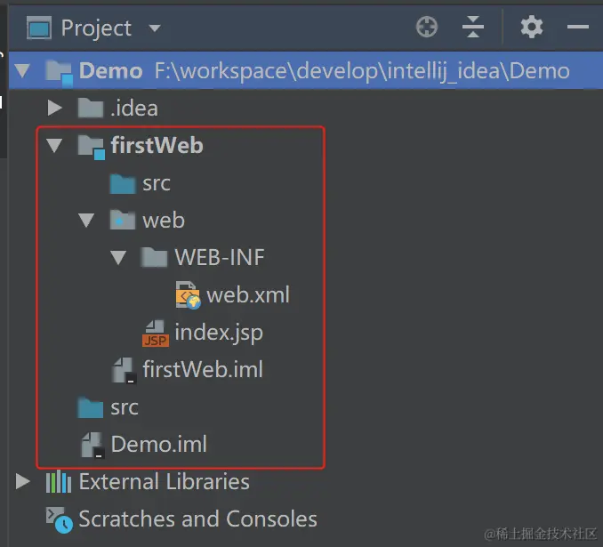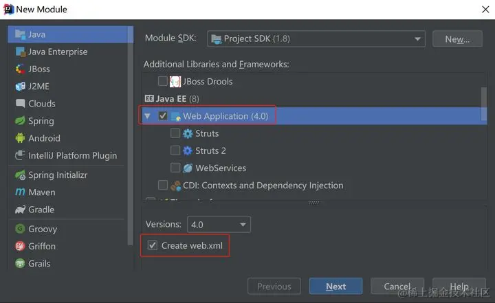 鼠标点中项目名称Demo -> 右键选择New,选择Module->同时勾选web application和create web.xml