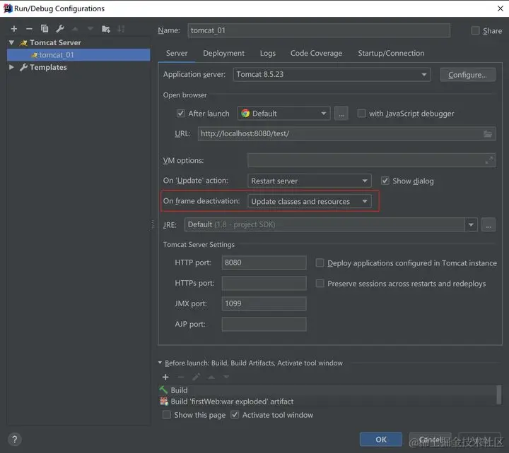 在tomcat配置中的Server选项卡中的On frame deactivation:选择“Update classes and resources”,使项目发布在tomcat上热更新相应的源文件