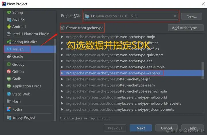 File->New Project->选中Maven,选择指定的JDK版本,勾选“Create from archetype”,随后选中“org.apache.maven.archetype”,并指定“org.apache.maven.archetypes:maven-archetype-webapp”选项