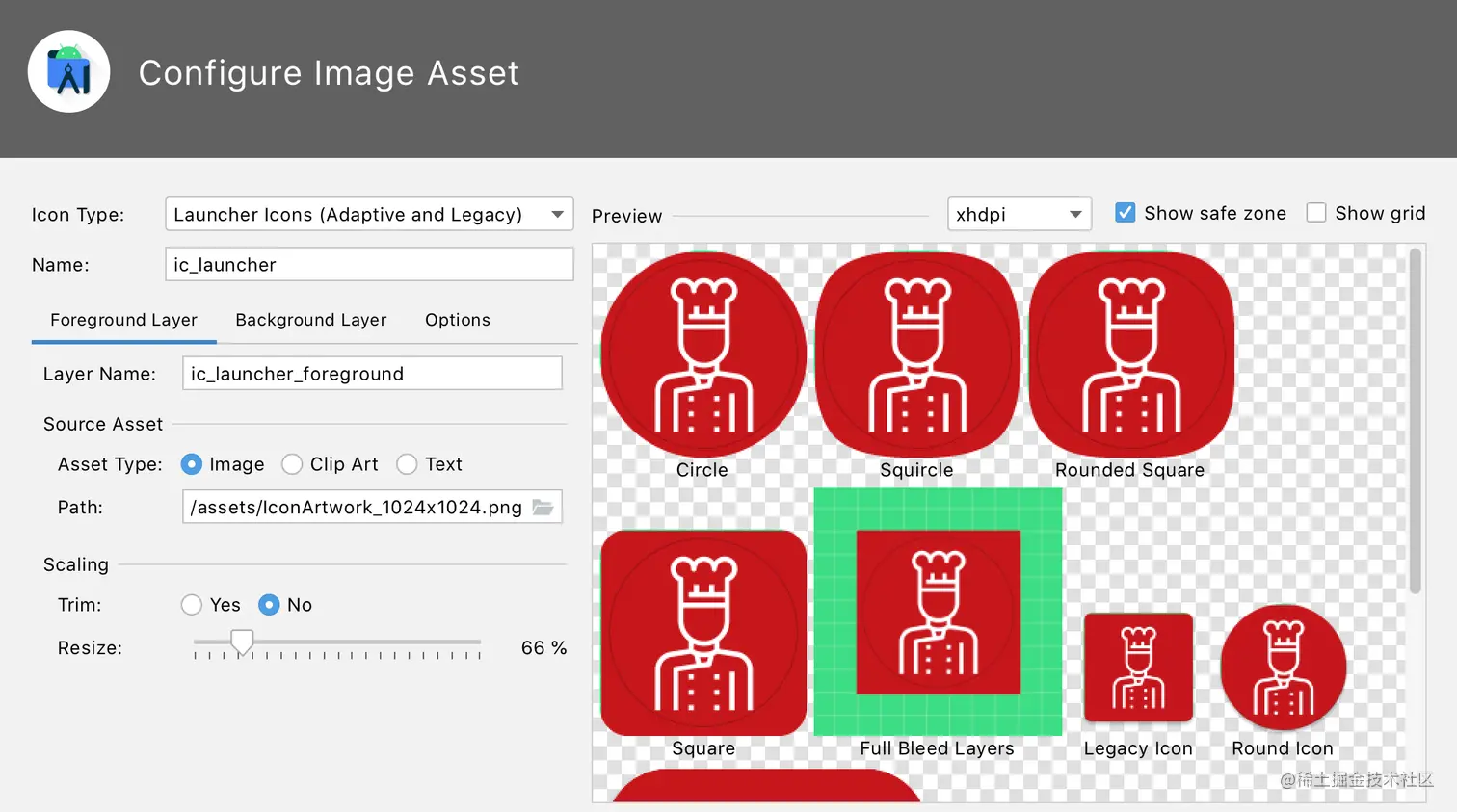 @mipmap部分意味着它解析到 mipmap-{resolution} 文件夹以加载正确设备屏幕比例的图形。ic_launcher是图标的文件名。