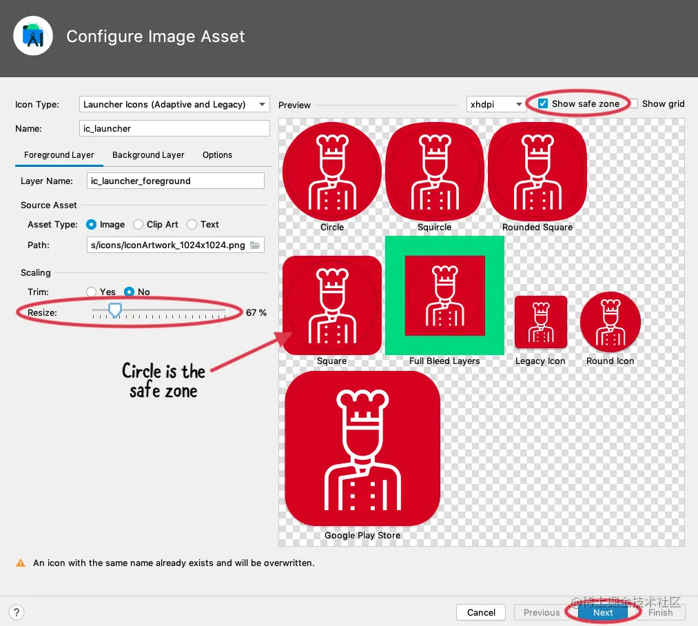 很好,你刚刚把默认的资产换成了一些很酷的自定义资产。如果你需要调整图标的填充尺寸,或者如果你以后要做自己的应用程序,想要导入安卓图片,你需要导入并调整艺术品的尺寸。这就是下一步!