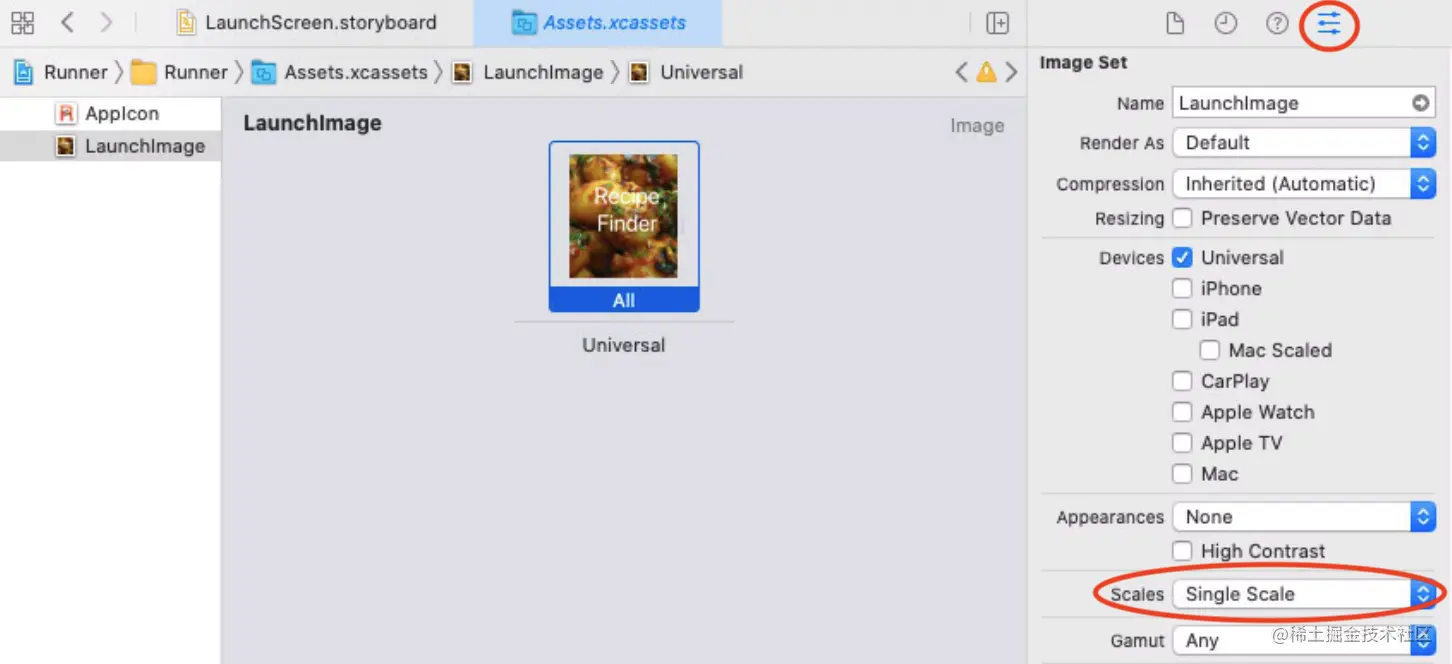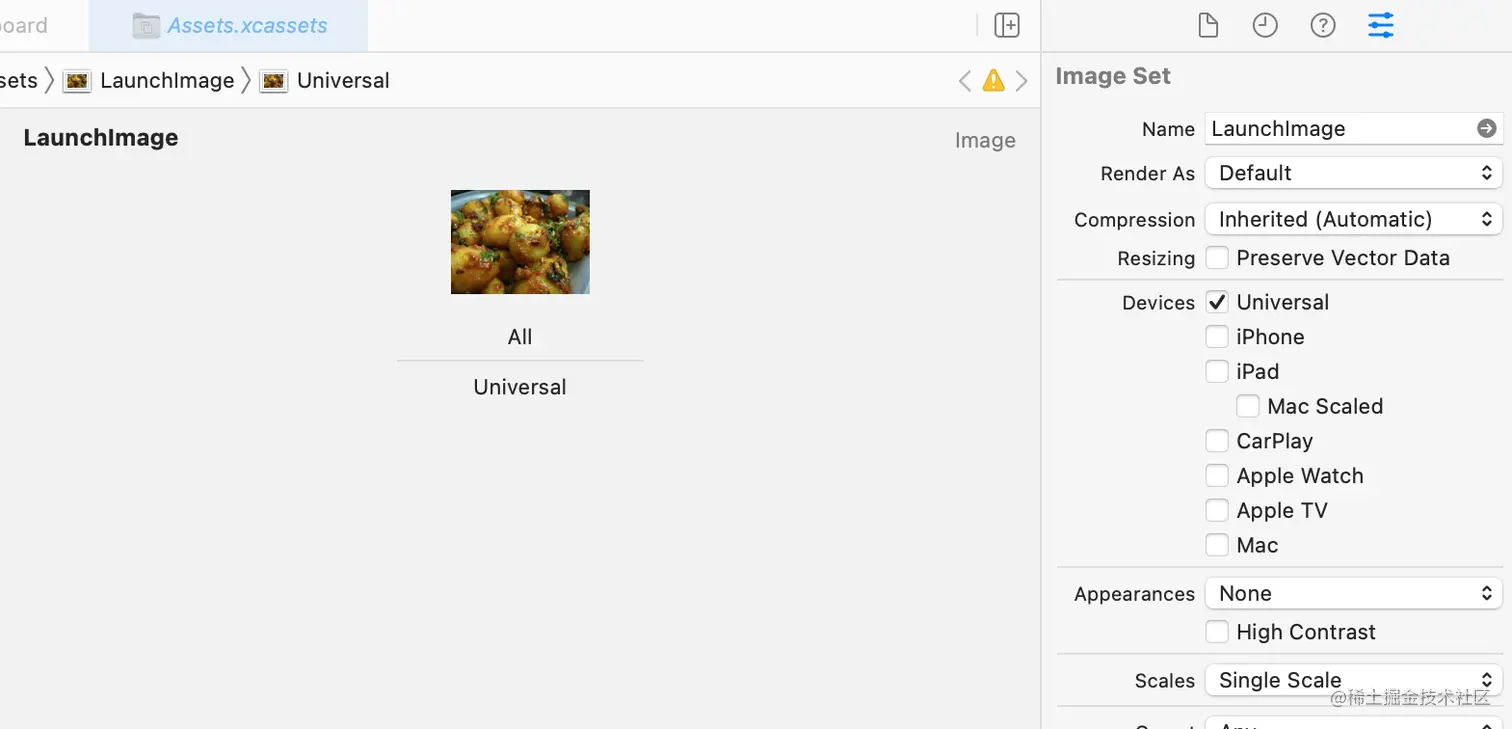 在资产目录中打开LaunchImage。在属性检查器中,将规模值改为单一规模。这个设置让系统知道该图像只有一个版本。对于像照片这样的图像,这是首选,因为它有一个原始分辨率。