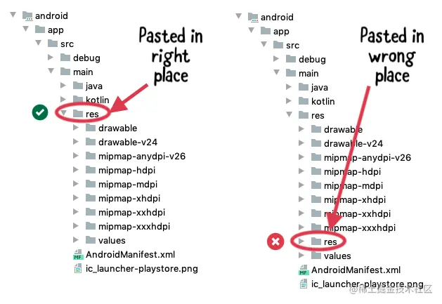 展开android/app/src/main/res文件夹,确认你已经将res文件夹粘贴在正确的位置。它应该与java和kotlin文件夹处于同一级别,而不是在现有的res文件夹内。