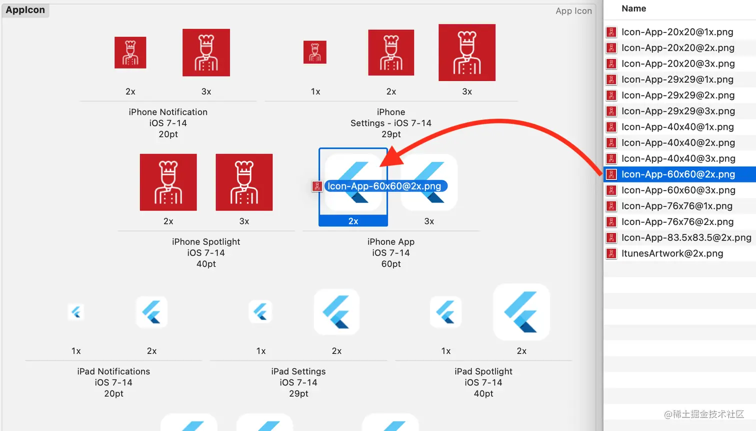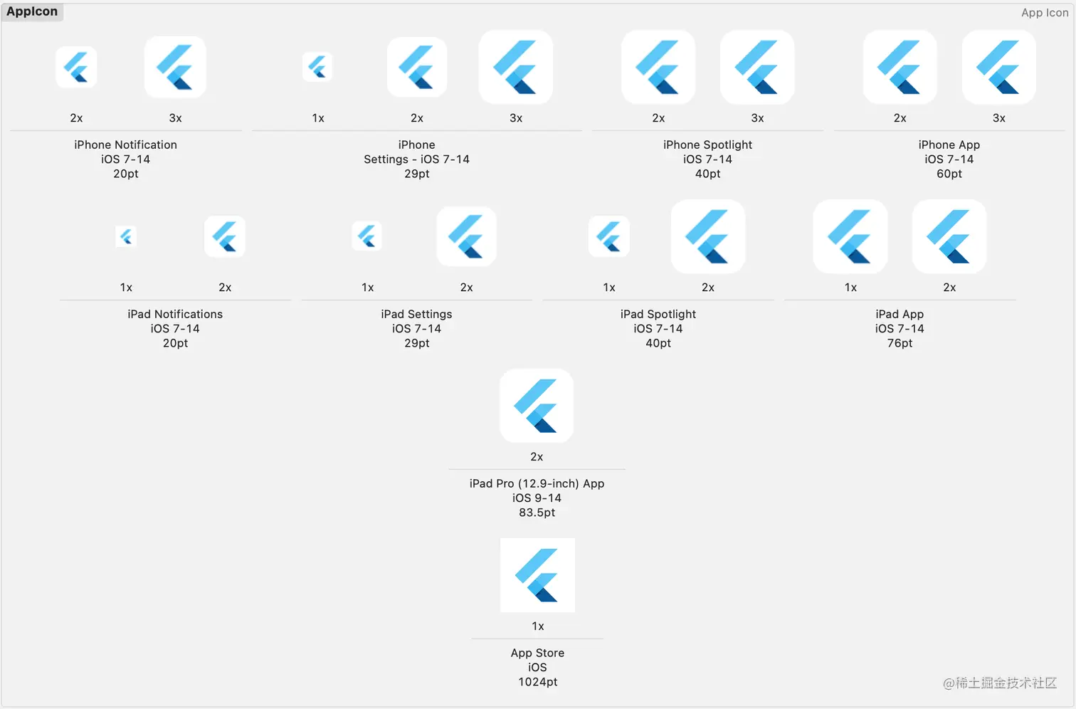 点击AppIcon可以看到默认Flutter图标所支持的所有设备和分辨率。