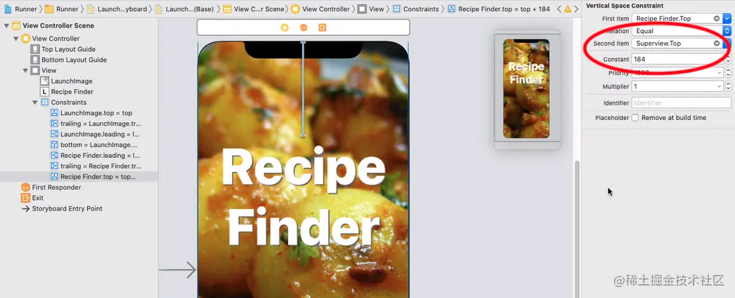 屏住呼吸,以美学的名义完成最后一个步骤。仍然选择标签,移到尺寸检查器。双击垂直的约束,在编辑器中打开该约束。将第二项从Top.Layout Guide.Bottom改为Superview.Top。