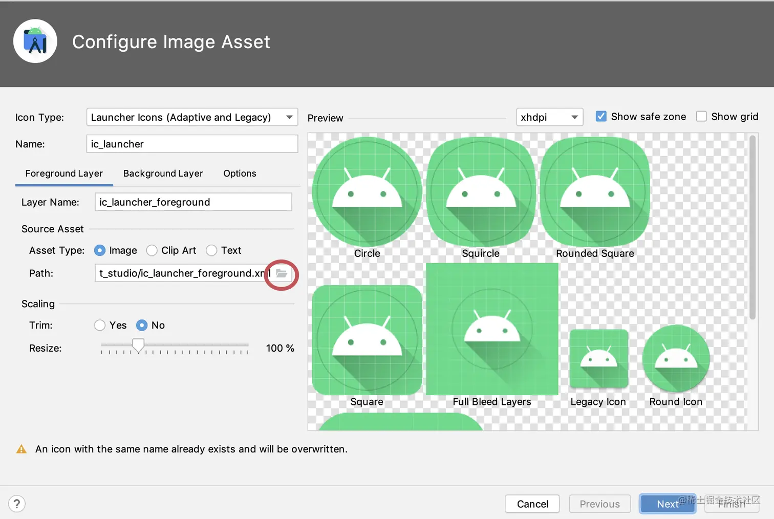 下一个屏幕会显示你要保存资产的路径。请记住这是为Android项目准备的,而不是你的Flutter项目,所以文件夹层看起来与你到目前为止所做的不同。保留默认值并点击完成。