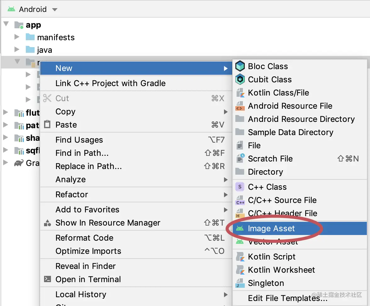 导航到app文件夹,右键点击res,选择New ▸ Image Asset。