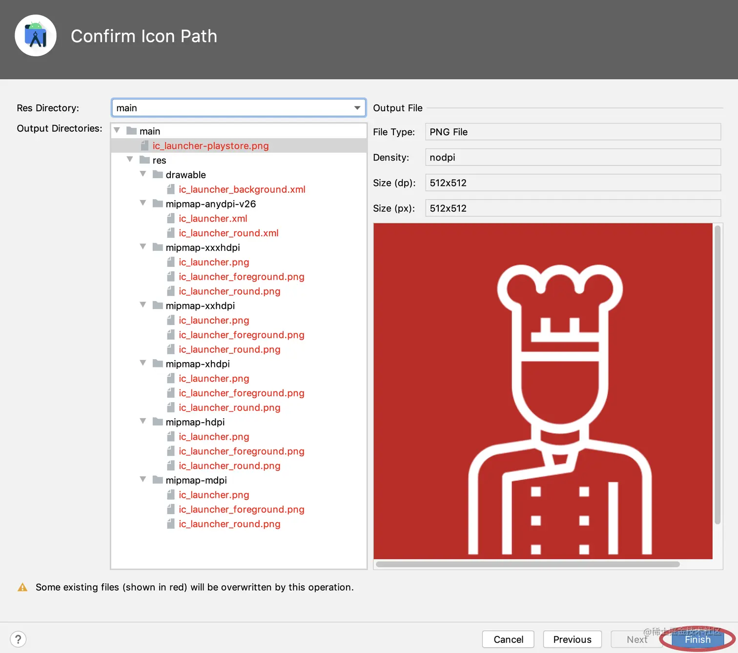 在Finder中,打开章节材料中的assets/icons/android。从Finder中复制res文件夹并在Android Studio中替换android/app/src/main/res。