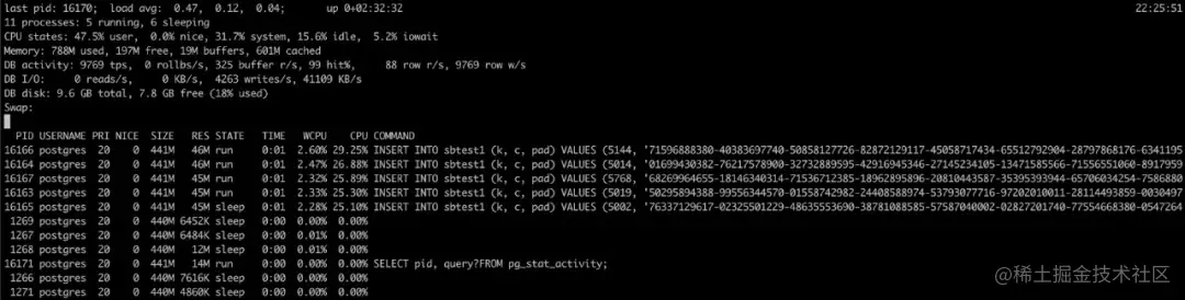 如果已经知道PostgreSQL进程的内存利用率很高,但日志没有看出什么问题,还可以使用另一个工具 pg_top 。