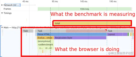 这也引出了一个重要的问题:进行准确的测量。一个常见的错误是使用Date.now(),相反你应该使用performance.now(),因为它会给你一个更精确的时间戳。或者更好的是,使用performance.mark()和performance.measure(),这些也是高精准度的,还有一个好处是你可以在Chrome DevTools中看到你的测量结果。这是个很好的方法,可以反复检查你是否真的在检测你认为要检测的东西。