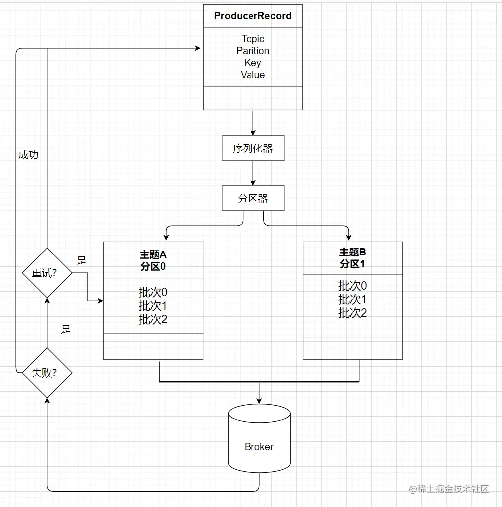 首先需要创建一个ProduccerRecord对象,该对象包含了目标主题和要发送的内容,发送ProducerRecord对象时生产者需要把键和值对象序列化成字节数组才能在网络上传输。接着数据传给分区器,分区器根据分区策略将消息发送到主题和分区。然后这条消息被添加到一个记录批次里,这个批次里的所有消息都会被发送到相同的主题和分区上,并且有一个独立的线程负责把这些记录批次发送到相应的broker。服务器收到消息后会返回响应,如果消息成功写入Kafka,就返回一个RecordMetaData对象,它包含了主题和分区信息,并且记录了消息在分区内的偏移量。如果写入失败,则返回错误信息,并且会尝试重新发送消息。如果重试超过一定次数,那么直接返回错误信息。具体流程如下图所示。