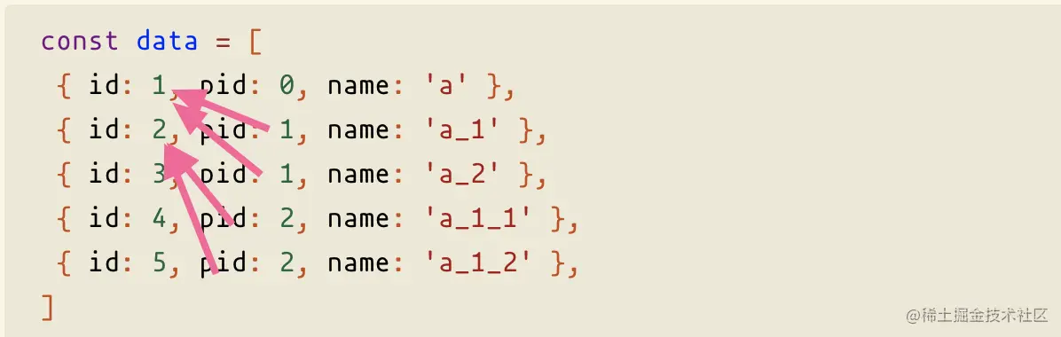 父级别层面的id会作为子层级的pid,由此一层层往下延伸(真实开发的数据不一定是id和pid,这里是id和pid)