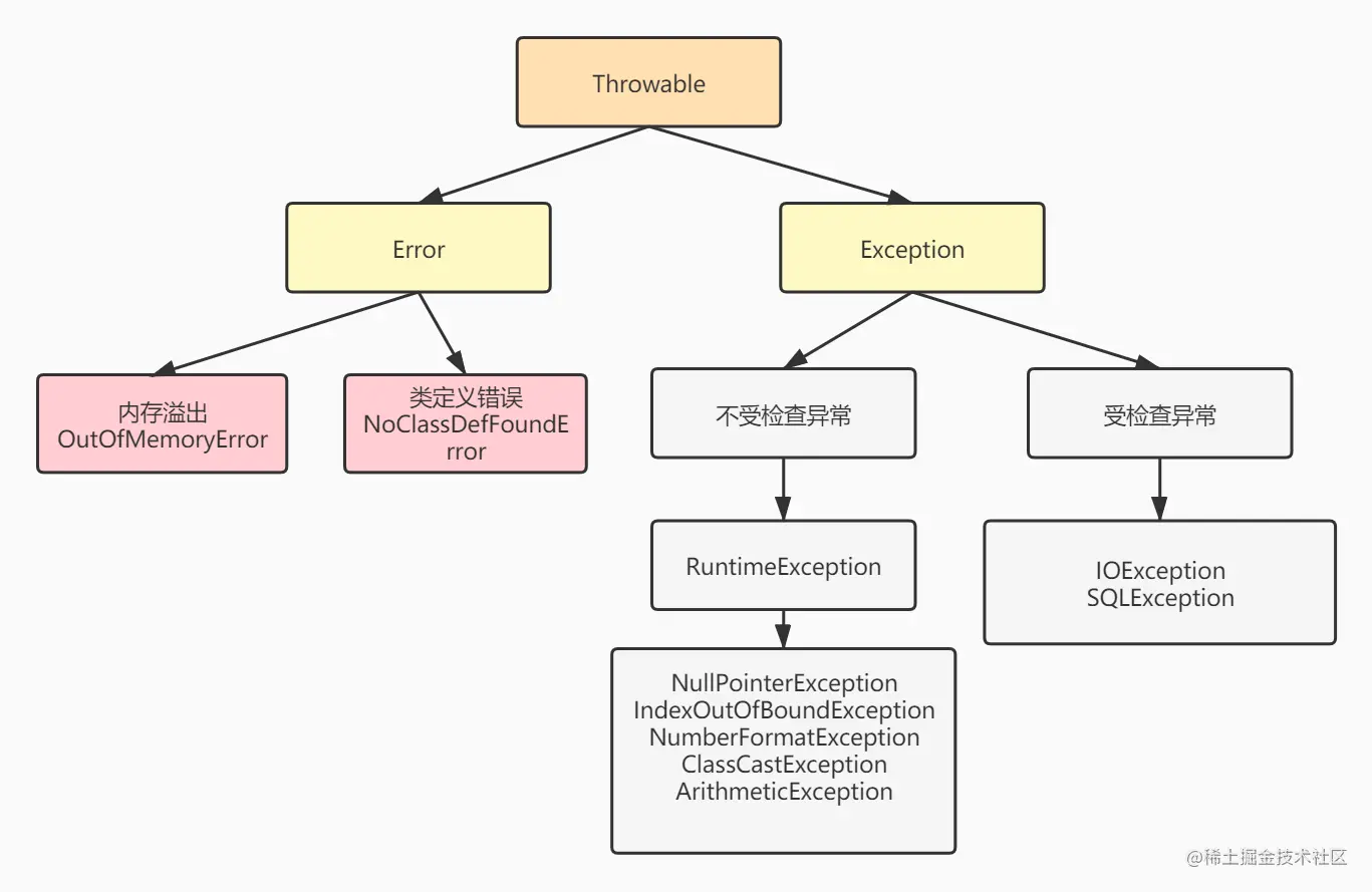 Java中的异常都来自于java.lang.Throwable类,从异常类型上分,Java中的异常可以分为Exception和Error。Exception异常可以被程序本身处理,Error无法被程序处理。