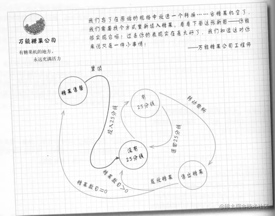 - 最后用逻辑代码和判断让糖果机内部进行工作,当然这会出现巨多的if/else判断。