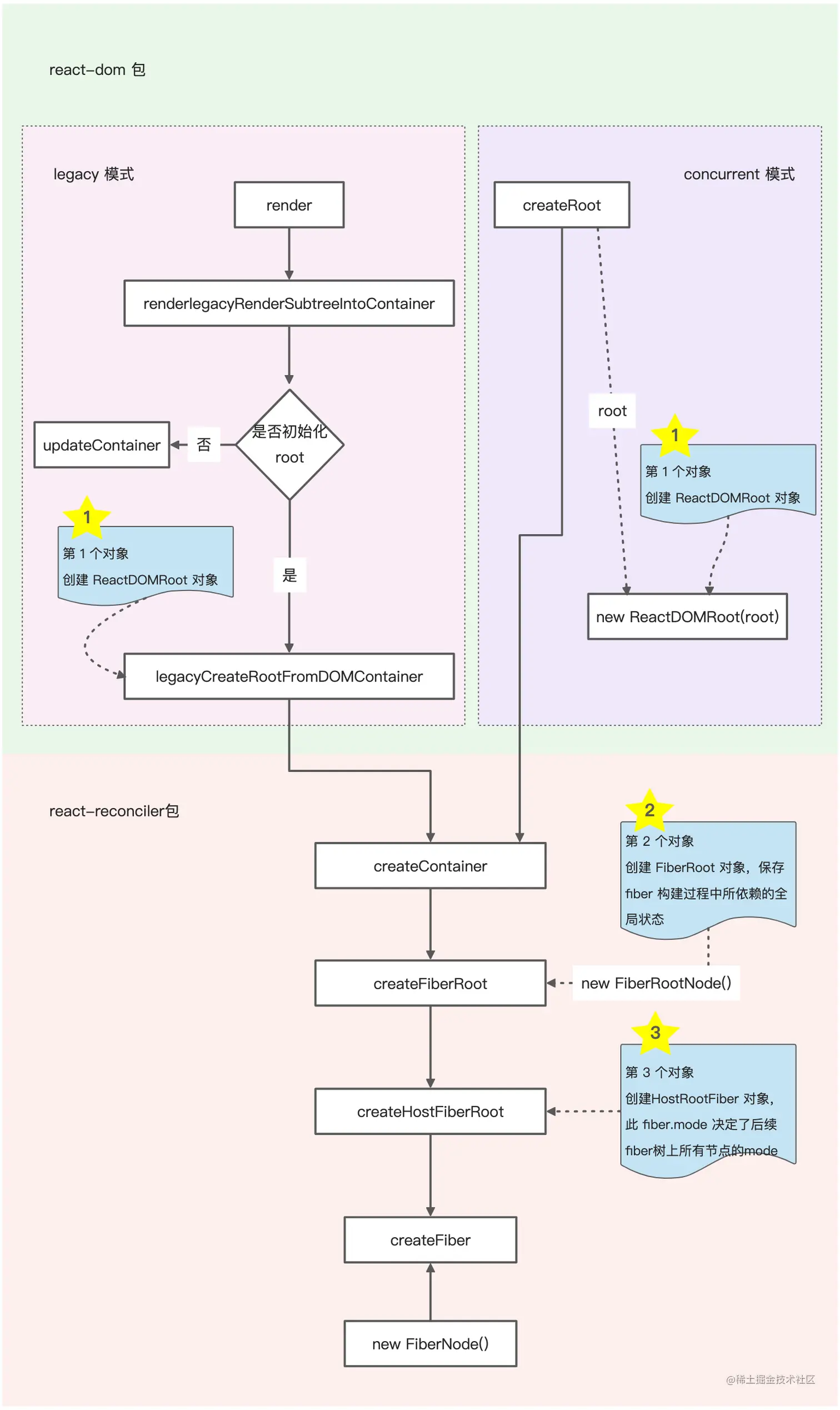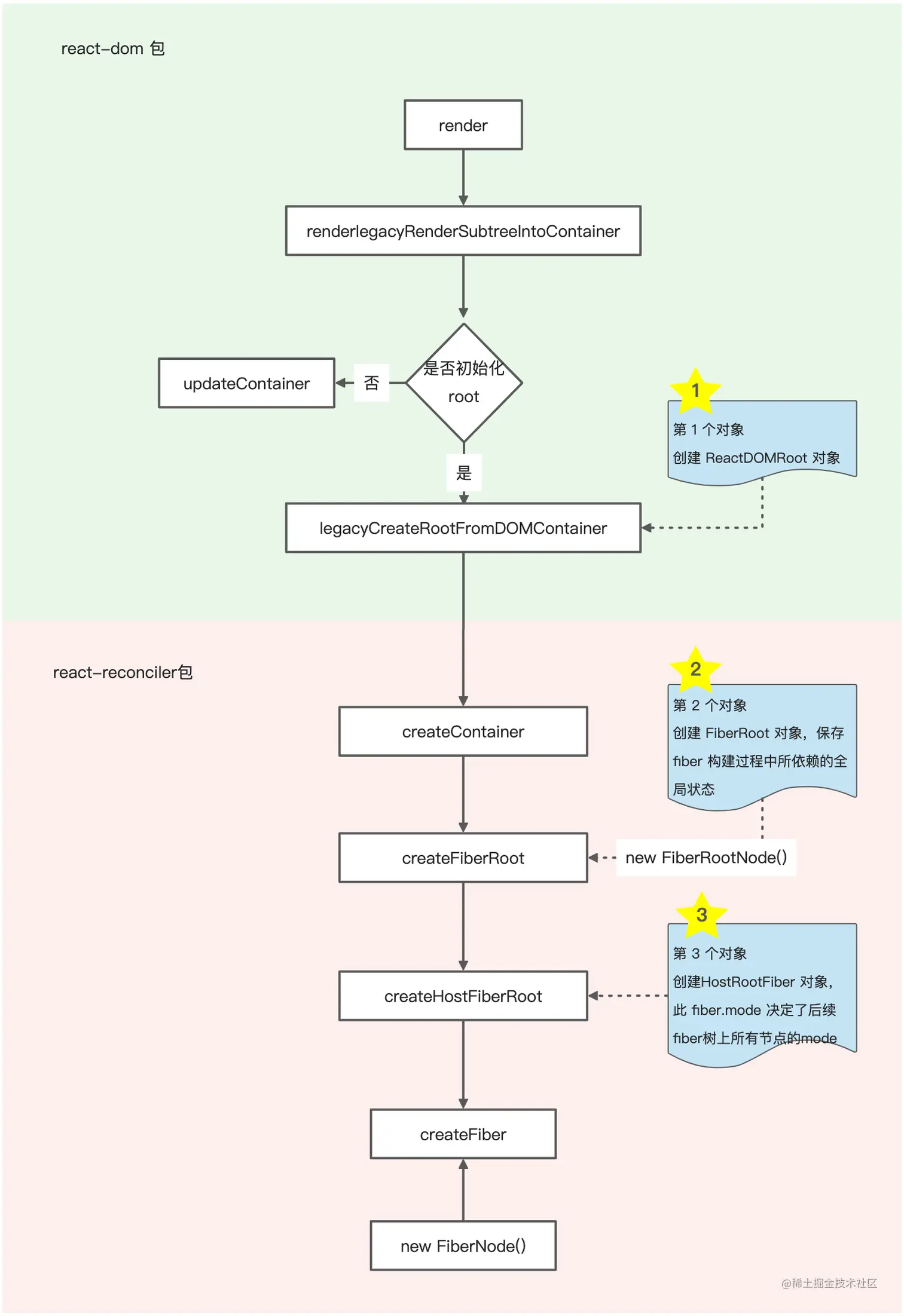 legacy 模式的启动过程,是从 react-dom 包发起,内部调用了 react-reconciler 包,其流程如下: