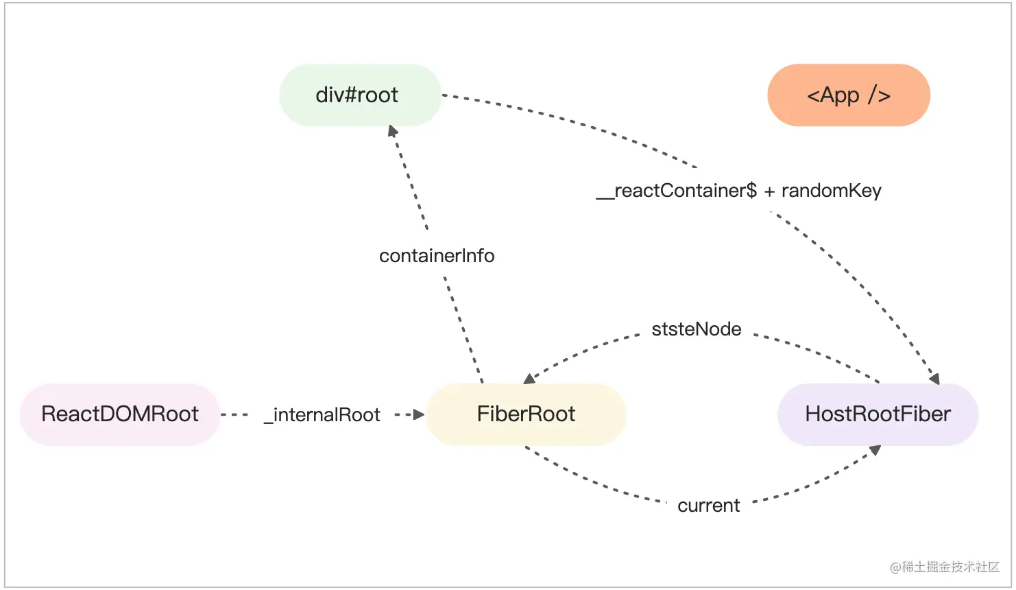 ReactDOMRoot、FiberRoot、HostFiberRoot 这三个对象在内存中的引用关系也不是完全相同。legacy模式中通过 ReactDOMRoot 对象的 _reactRootContainer 属性与跟容器div#root 关联在一起,而在 Concurrent模式中是通过 ReactDOMRoot 对象的 _internalRoot 属性与 FiberRoot 对象关联在一起。