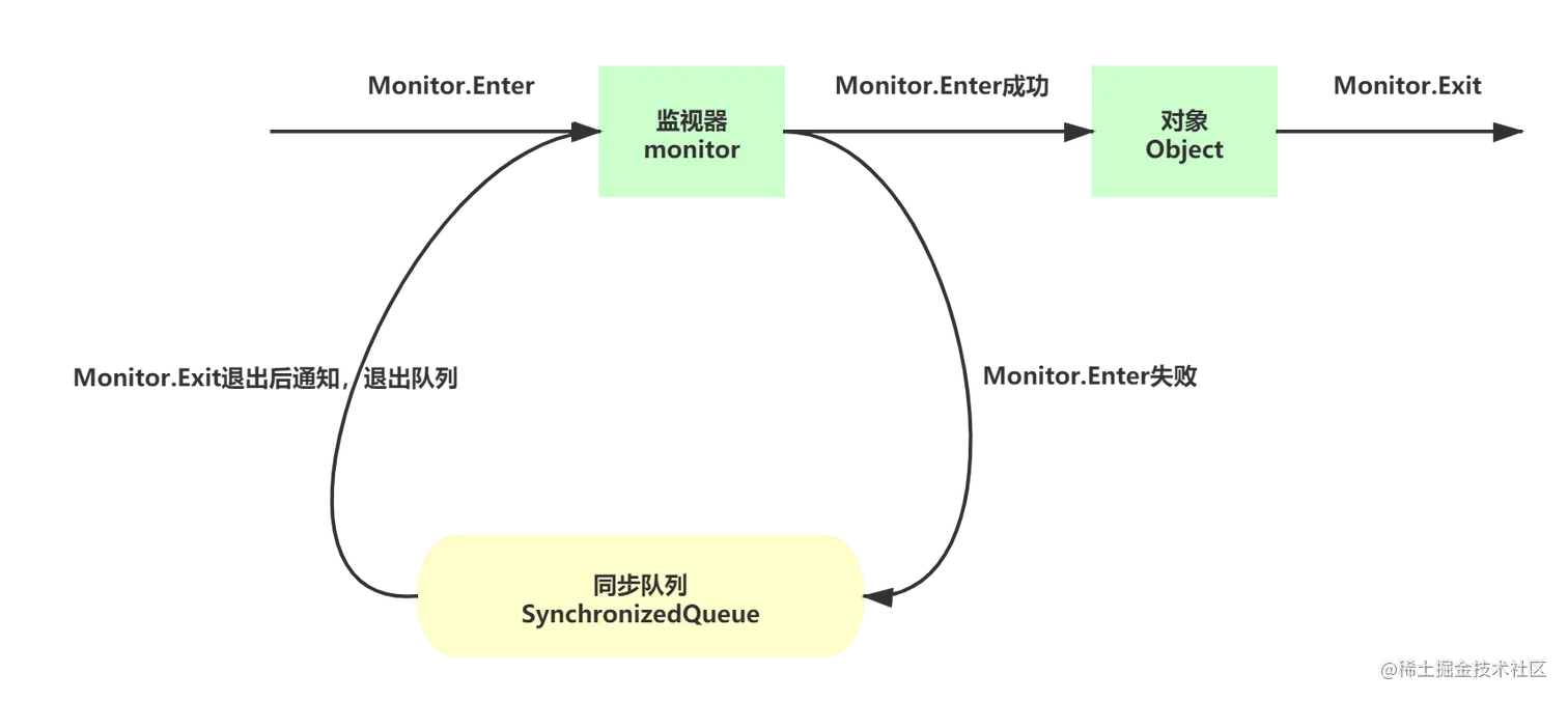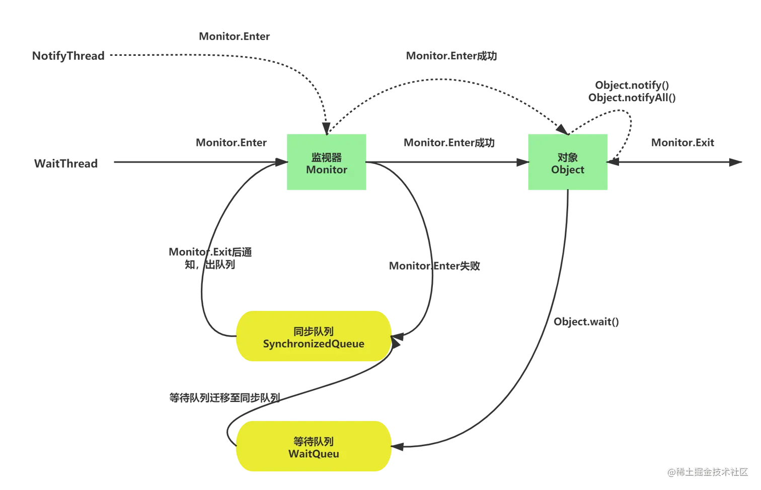 任意线程对Object(受Synchronized保护)的访问,首先要获取Object的监视器。如果获取失败则进入同步队列,线程变为BLOCKED。当访问Object的前驱(获得了锁的线程)释放了锁,则该释放操作唤醒阻塞在同步队列中的线程,使其重新尝试对监视器的获取。