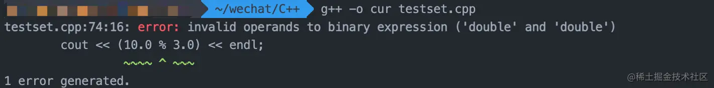 取模运算符求的就是一个数除以另外一个数之后的余数。这里要注意,在其他语言当中并没有对取模运算的限制,而在C++当中,严格限制了取模运算的对象只能是整数。否则编译的时候会报错: