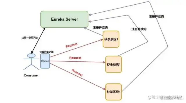 其工作原理就是 Consumer 端获取到了所有的服务列表之后,在其内部使用负载均衡算法,进行对多个系统的调用。