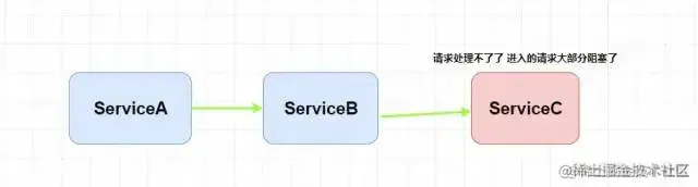 那么什么是 熔断和降级 呢?再举个🌰,此时我们整个微服务系统是这样的。服务A调用了服务B,服务B再调用了服务C,但是因为某些原因,服务C顶不住了,这个时候大量请求会在服务C阻塞。