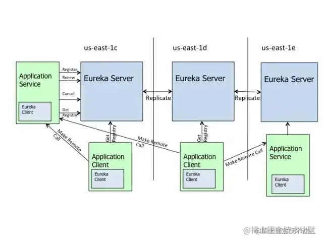 下面就是 Netflix 官方给出的 Eureka 架构图,你会发现和我们前面画的中介图别无二致。