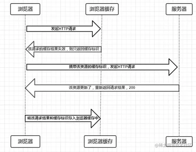 协商缓存:强缓存失效后,浏览器携带缓存标识向服务器发送请求,由服务器根据缓存标识判断是否使用缓存过程,有以下两种情况。