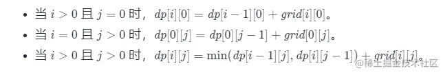 创建二维数组dp,与原始网格的大小相同,dp[i][j] 表示从左上角出发到 (i,j)位置的最小路径和。显然,dp[0][0]=grid[0][0]。对于dp 中的其余元素,通过以下状态转移方程计算元素值。