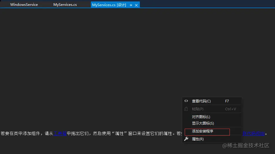 3、在MyServices.cs[设计]界面右击,选择“添加安装程序”