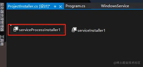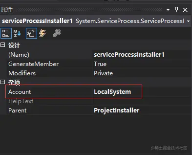 4、单击ProjiectInstall.cs文件,然后单击serviceProcessInstaller1,属性栏的"Account"按需修改,我选择的"LocalSystem",