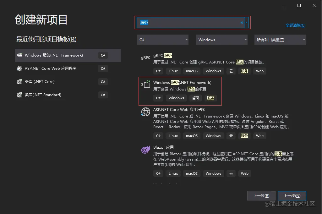 1、打开vs,新建windows服务程序(本实例使用vs 2019)。
