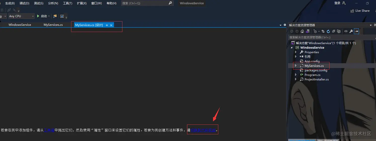 2、点击MyServices.cs[设计]界面的切换到代码视图