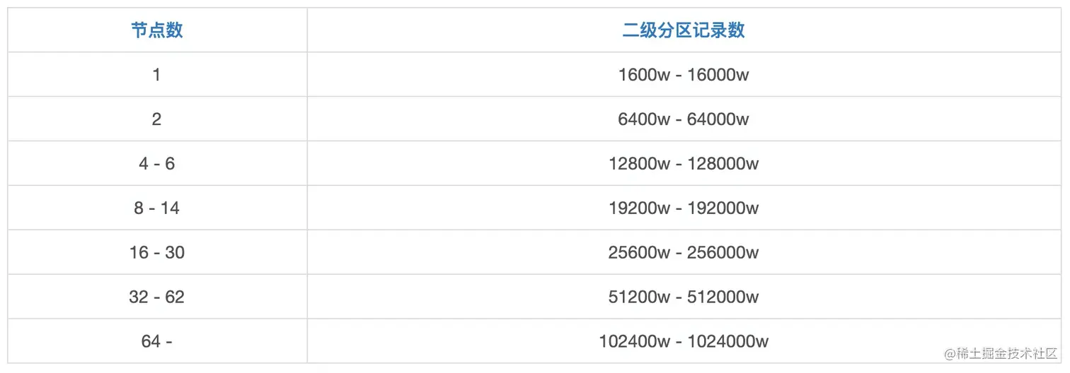 二级分区的数据量建议: