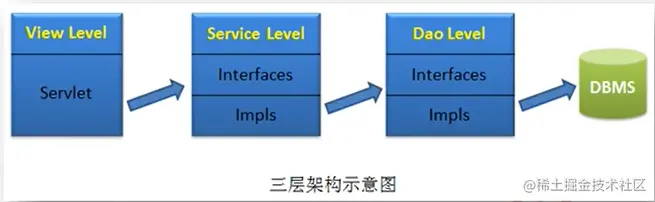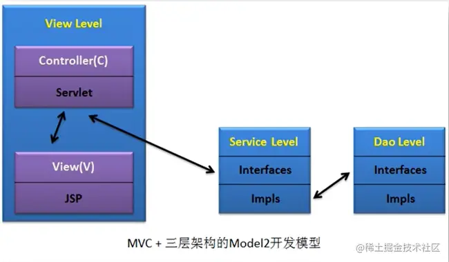 - 蓝色是三层架构,紫色的是MVC,将MVC的Model层分为:Service与Dao。