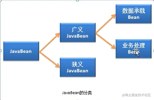 侠义JavaBean,是指符合SUN公司提出的“JavaBean”规范的Java类。 JaveBean规范规范,满足以下四点的Java类,称为JavaBean: