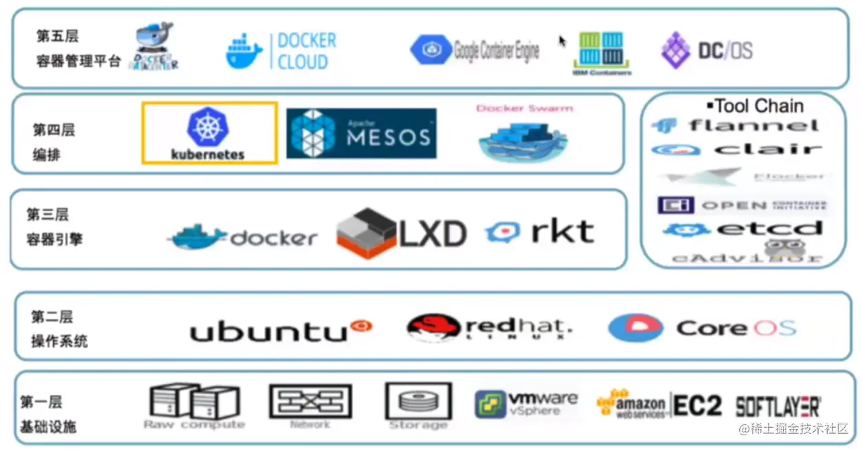 kubernates 并非唯一、也非最早的分布式集群应用编排工具,在整个应用架构的第四层容器编排层有众多开源的实现,但都可以抽象看做 高动态集群运维模型 DCOM 的实现。