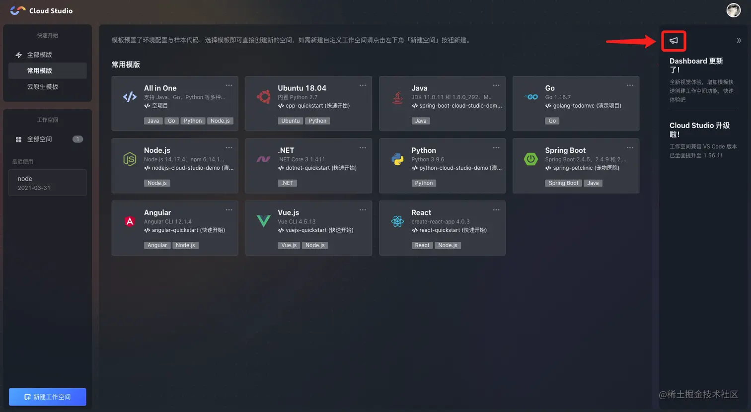 - 请前往 PC 端进入 Cloud Studio* (cloudstudio.net)*,【登录/注册】CODING 或 GitHub 账号后,在 Cloud Studio 中从模板库中选择所需镜像,构建插件、代码仓库(项目或者框架不限)和可运行环境。