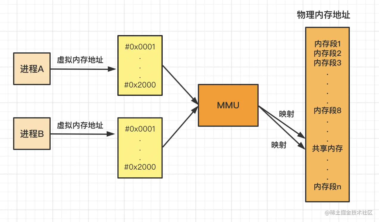 例如进程A的虚拟内存地址范围可以是#0x0001~#0x2000,B进程同样也可以占用这个地址,操作系统把它们的虚拟内存映射到了不同的物理内存。