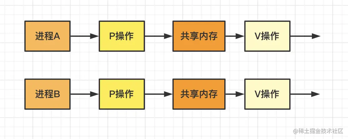 看一个场景,假设进程A在访问共享内存时不允许进程B访问,则可以用信号量实现互斥: