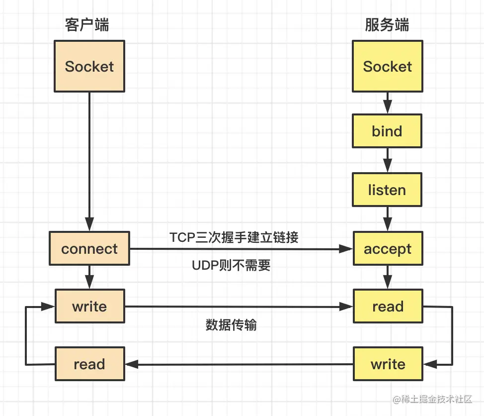 客户端调用connect向服务端端IP和端口发起连接请求,建立连接后在调用read和write分别读取和发送数据,完成客户端与服务端的数据传递。