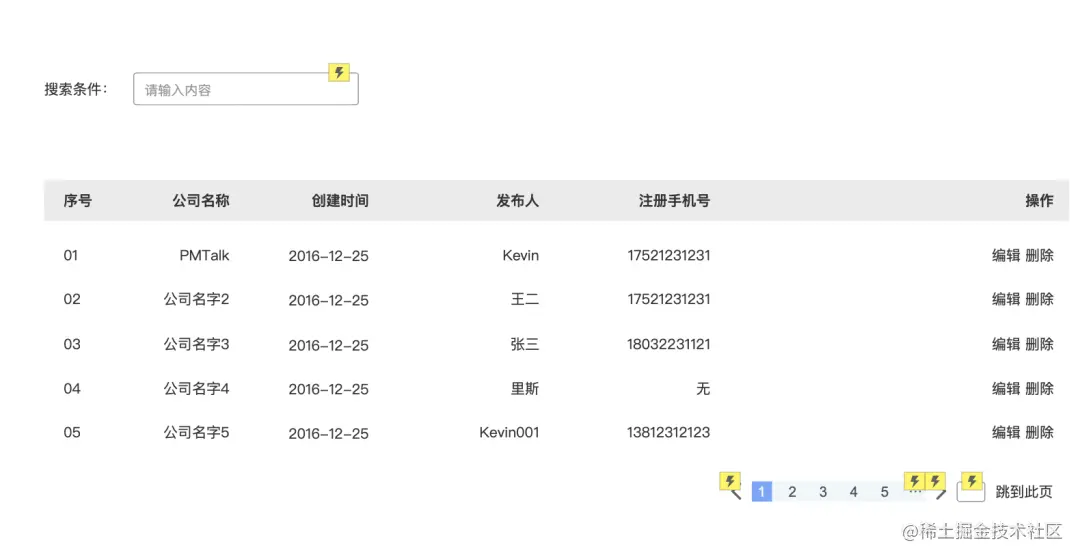 针对「作息表」的内容进行管理,包括用户发布名字、创建时间、注册手机号、操作(内容管理)进行展示。方便内容检索增加搜索入口,通过公司名字进行搜索。