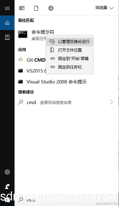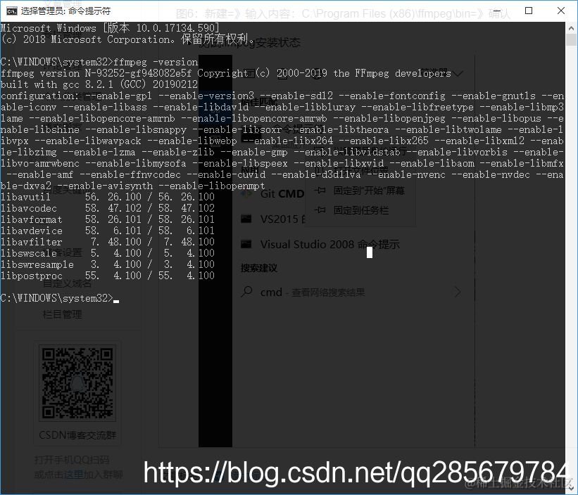 图6、7:搜索并打开cmd=》管理员身份打开=》输入命令:ffmpeg -version 结果如下图说明安装成功。
