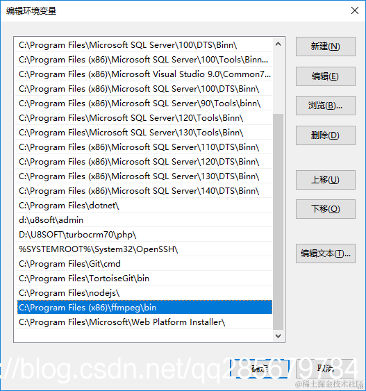 图6:新建=》输入内容:C:\Program Files (x86)\ffmpeg\bin=》确认