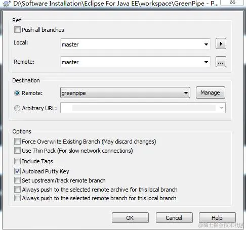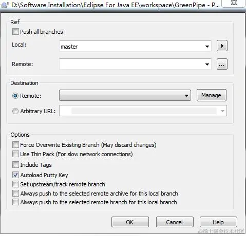 以上步骤完成之后,再之前图中的“Remote:”右面的文本框中输入“master”,master是主版本的意思,可以在之后创建分支版本,截图如下: