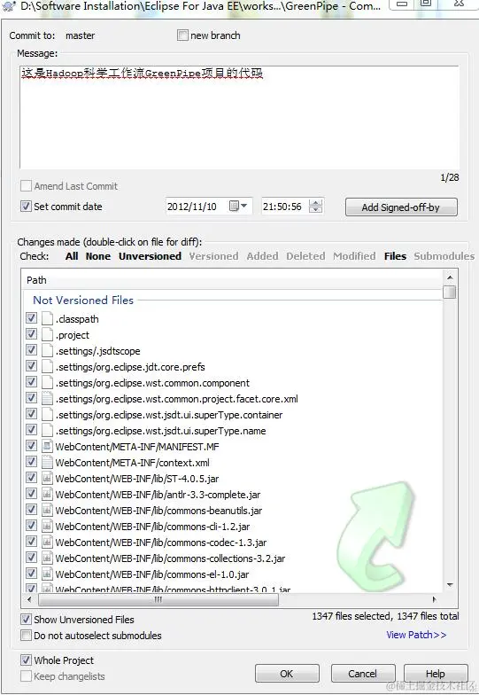 文本框的内容不能为空!!! 下面的框里是可以选择更新的代码文件,由于第一次上传,我选择了全部更新,然后点击Ok完成“commit”操作。